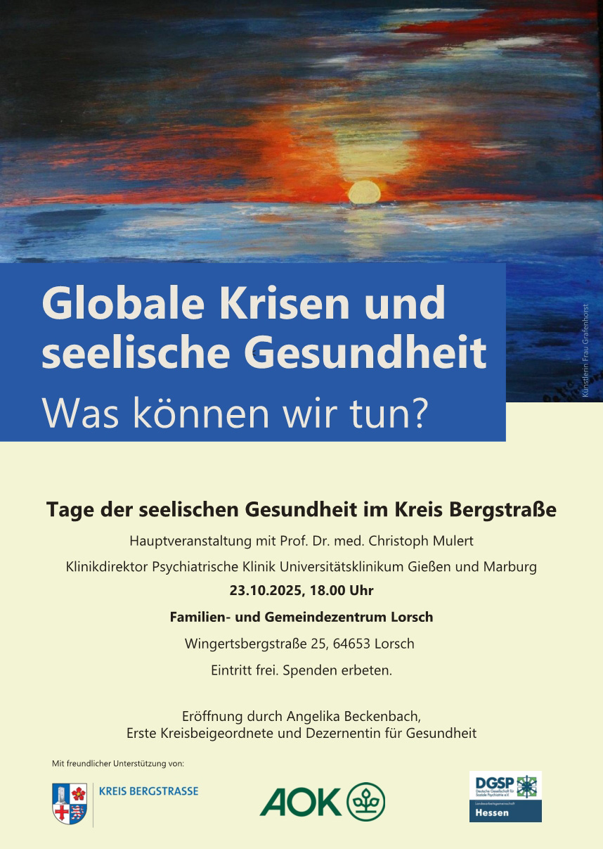 Die Hauptveranstaltung findet am Donnerstag, 23. Oktober, ab 18:00 Uhr im „Haus Emmaus“, dem Familien- und Gemeindezentrum der Evangelischen Kirchengemeinde Lorsch (Wingertsbergstraße 25), statt. Prof. Dr. med. Christoph Mulert, Klinikdirektor der Psychiatrischen Klinik am Universitätsklinikum Gießen und Marburg, widmet sich dem Thema: